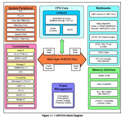 S5PV210AA0-LA40 features: (1)ARM CortexTM-A8 based CPU Subsystem with NEON; (2)64-bit Multi-layer bus architecture; (3)MIPI-DSI and MIPI-CSI interface support; (4)1 AC-97 audio codec interface and 3-channel PCM serial audio interface; (5)3 24-bit I2S interface support; (6)1 TX only S/PDIF interface support for digital audio; (7)3 I2C interface support; (8)3 SPI support; (9)4 UART which support 3Mbps port for Bluetooth 2.0; (10)On-chip USB 2.0 OTG supporting high speed (480Mbps, on-chip transceiver); (11)On-chip USB 2.0 Host supporting; (12)Asynchronous Modem Interface support; (13)4 SD/SDIO/HS-MMC interface support.; (14)ATA/ATAPI-6 standard interface support.